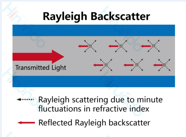 When the light beam propagates forward in the optical fiber, it will scatter when encountering discontinuities in the optical fiber. The discontinuities may be caused by impurities in the fiber material, tiny air gaps, or even mechanical stretching. There are many types of scattering, the most common of which is Rayleigh scattering, whose intensity is inversely proportional to the fourth power of the wavelength of light. The main difference between Rayleigh scattering and Fresnel reflection is that Rayleigh scattering exists along the entire light path.