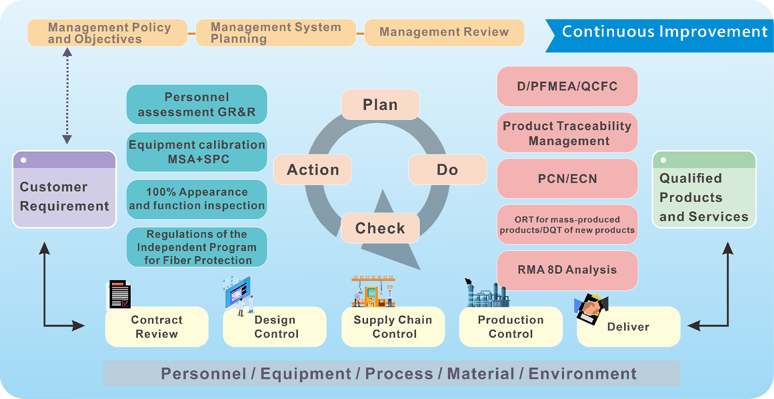 Hirundo adheres to the quality policy of "pioneering and enterprising, teamwork; continuous improvement, customer satisfaction". From the beginning of its establishment, it has strictly followed the ISO9001:2015 standard and has established a set of management systems in which all departments cooperate with each other and operate standardized, from front-line employees to management. Fully implement the cornerstone of "6S" on-site management, start with the six elements of human-machine-material-method environmental testing, use the PDCA-based cycle management model, use integrated quality tools in the product realization process, improve the personnel training mechanism, and promote all members to maintain common values and Fulfill the commitment to customer quality.