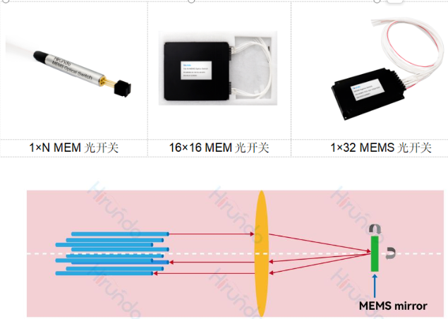 MEMS optical switches do not rely on the movement of physical components but use physical effects (such as electro-optical effects, magneto-optical effects, thermo-optical effects, etc.) to change the refractive index of the waveguide or the polarization state of light, thereby controlling the on and off of the light path. . The principle of the MEMS optical switch is very simple. When performing optical exchange, the angle of the MEMS micromirror is moved or changed through the driving of electrostatic force or magnetic force, and the input light is switched to different output terminals of the optical switch to realize the switching and on-off of the optical path. . MEMS refers to an integrated technology that creates micro-mechanical structures on semiconductor materials (such as Si). Applying MEMS technology to the field of photon switching, a new type of micromechanical optical switch (MEOMS) has emerged. Hirundo can provide 1XN/MXN MEMS optical switches, as shown below: