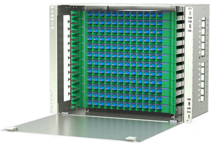 The modular ODF frame supports 576-core fiber management and is equipped with MPO-LC adapter panels for flexible jumping.