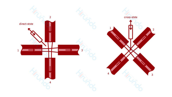 When the mirror is at the intersection of two rays, the optical switch is in the crossover state, and the light entering fiber 1 enters fiber 3, and the light entering fiber 2 enters fiber 4, so as to realize the switching of optical paths.